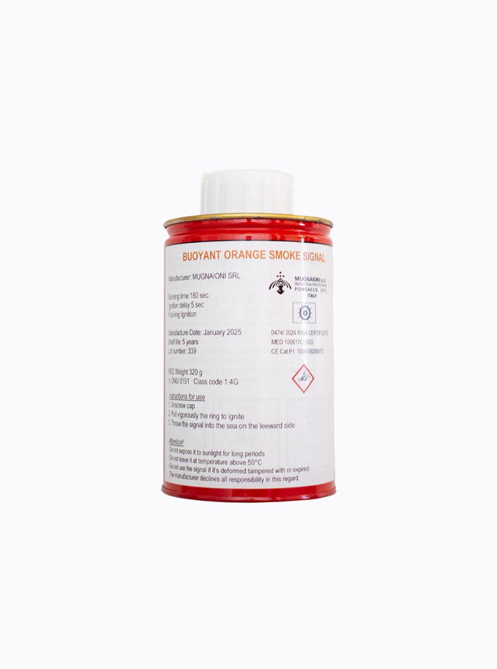 Il Buoyant Orange Smoke Signal è un segnale fumogeno galleggiante ad alta visibilità, ideale per le emergenze in mare. Una volta attivato, emette un denso fumo arancione facilmente individuabile anche a lunga distanza, sia da imbarcazioni che da mezzi aerei.